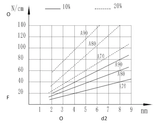 स्थापनाको बखत, कम्प्रेसन बल प्रारम्भिक कम्प्रेसनको डिग्री र सामग्रीको कठोरताका डिग्रीसँग सम्बन्धित छ। आंकडाले युनिट कम्प्रेसन बल र सेन परिषदको क्रस-अनुभागीय व्यास प्रति केन्द्रको बीचको सम्बन्ध देखाउँदछ, जुन O-R औंक स्थापना गर्दा कम्प्रेसन बलको आकार अनुमान गर्न प्रयोग गरिन्छ।